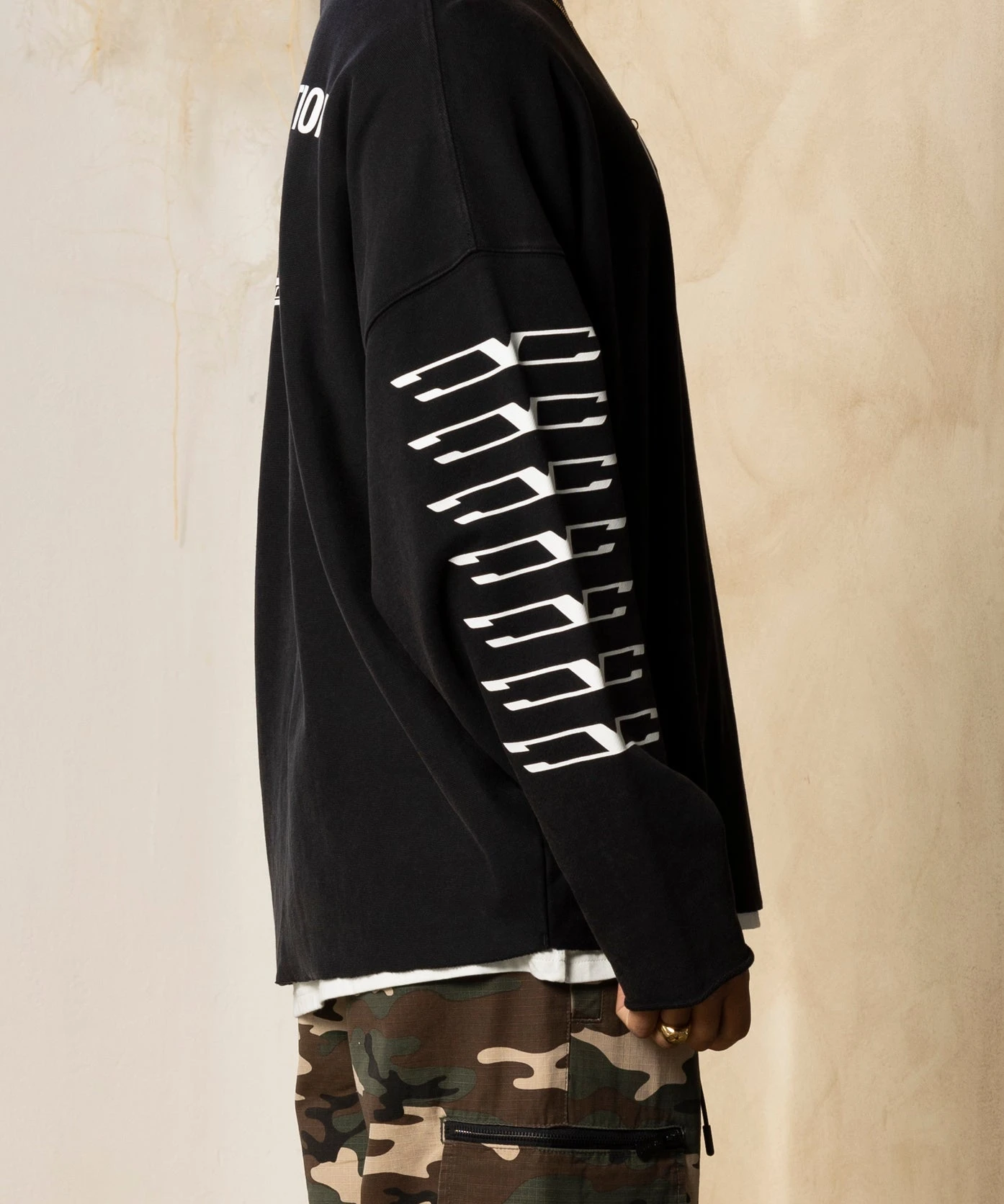 Edgy and comfortable, meet your new go-to piece. This crewneck features raw edges for a fire look, dropped shoulders for a laidback vibe and printed graphics to finish it off. Grab yours today.