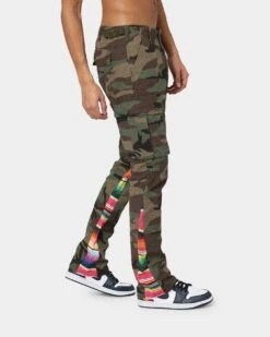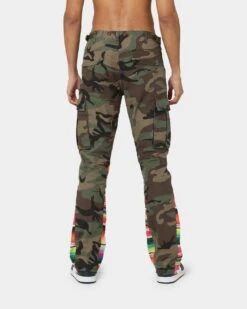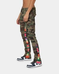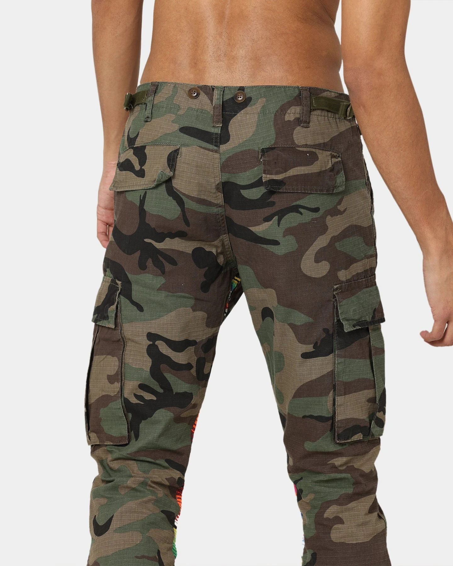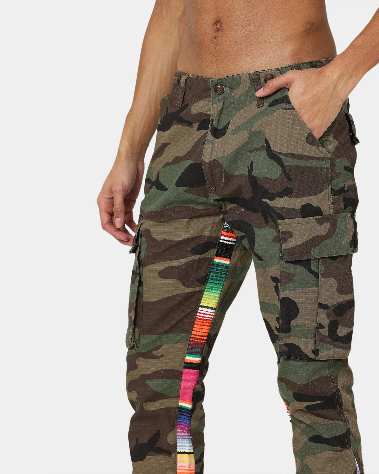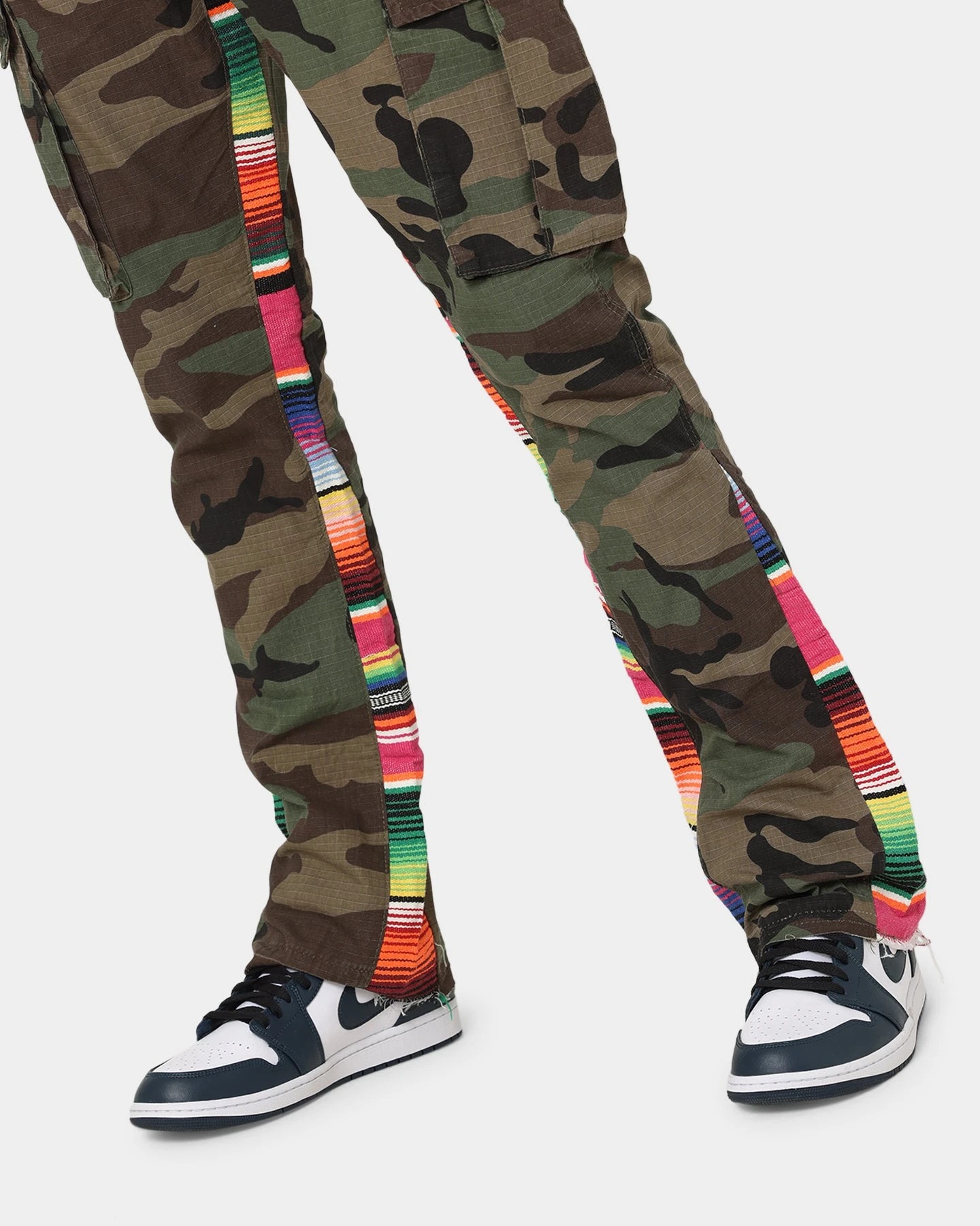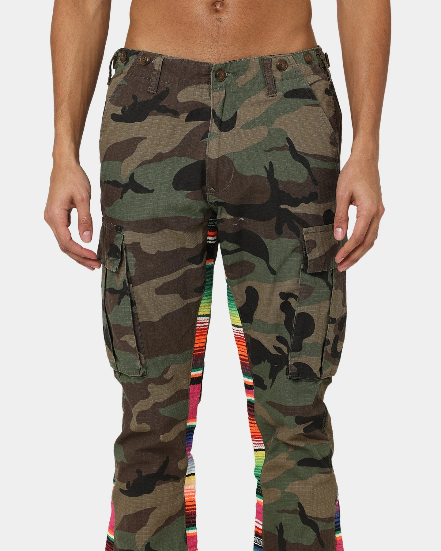 The Serape Bootcut Cargo Pants are your ticket to staying on top of the trends. The original design features contrasting multi-coloured blanket panels on the inseam and outseam as well as an all over camo print. The boldness carries into the cut of these pants with the flared, boot cut fit and exaggerated cargo pockets.