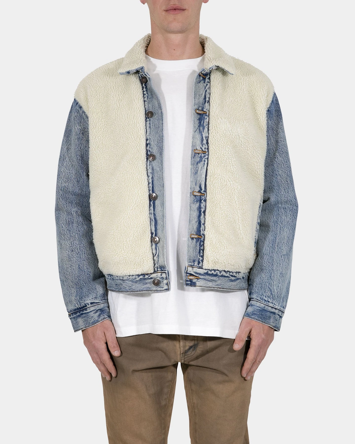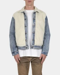 MNML knows how to do different and the Sherpa Body Trucker Jacket is proof of that. This jacket features a sherpa body panel with denim sleeves and trims and a full button-up closure to keep it toasty and stylish. MNML always has your back – Designed to last, this jacket is made with heavyweight rigid cotton denim, Sherpa. and a quilted inner lining for your comfort.