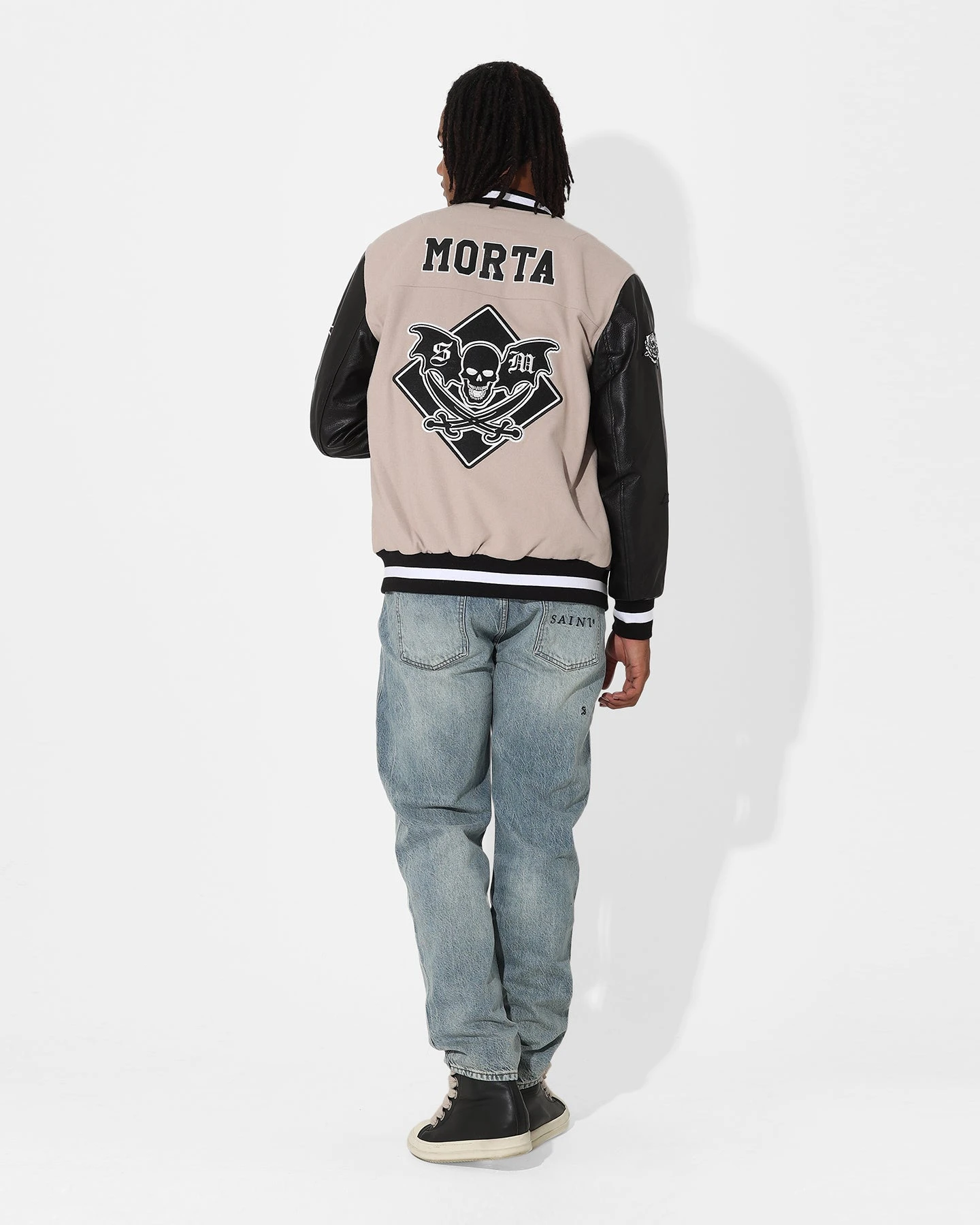 You’ll want to take a closer look at the Graveyard Varsity Jacket. A variety of mixed media Saint Morta graphics feature on a melton wool body and PU leather sleeves that make this jacket a premium piece to own.